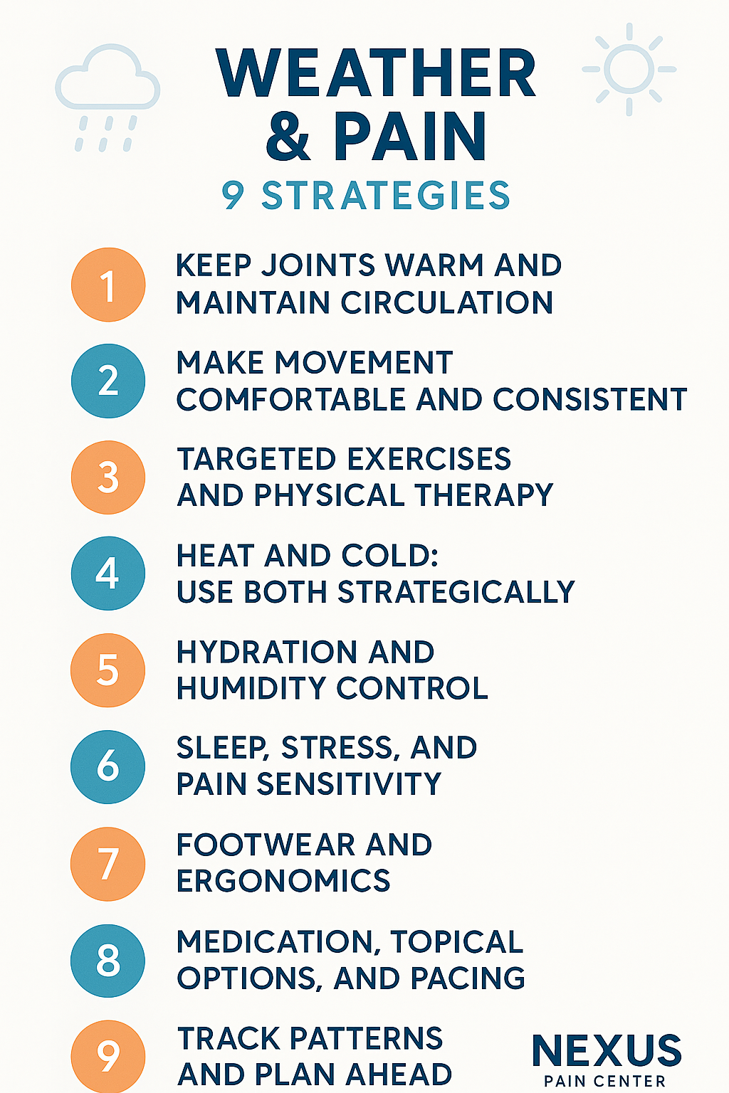 If symptoms limit daily life, interrupt sleep, or do not respond to reasonable self-care, a clinical evaluation is appropriate. Nexus Pain Center offers condition-specific care that anticipates weather-related patterns and focuses on lasting improvement: